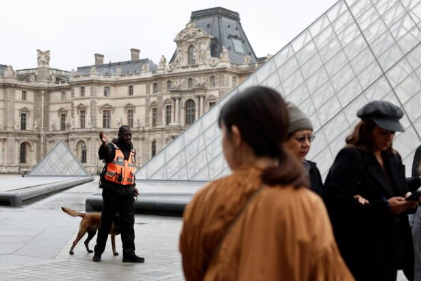 A security employee with a dog evacuates visitors from the area near the glass Pyramid…