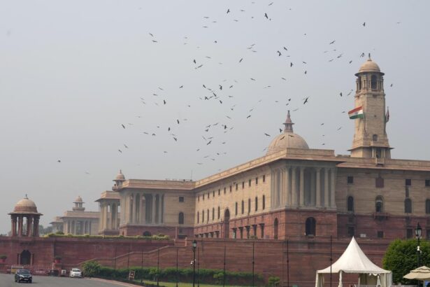 A view of the North Block of the Secretariat building shrouded in smog amid deteriorating…