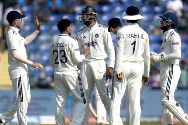 India’s Kuldeep Yadav celebrates with teammates after taking the wicket of West Indies’ Tevin Imlach…