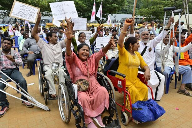 A file photo of members of the Karnataka State Disabled and Caregivers’ Federation demanding increase…