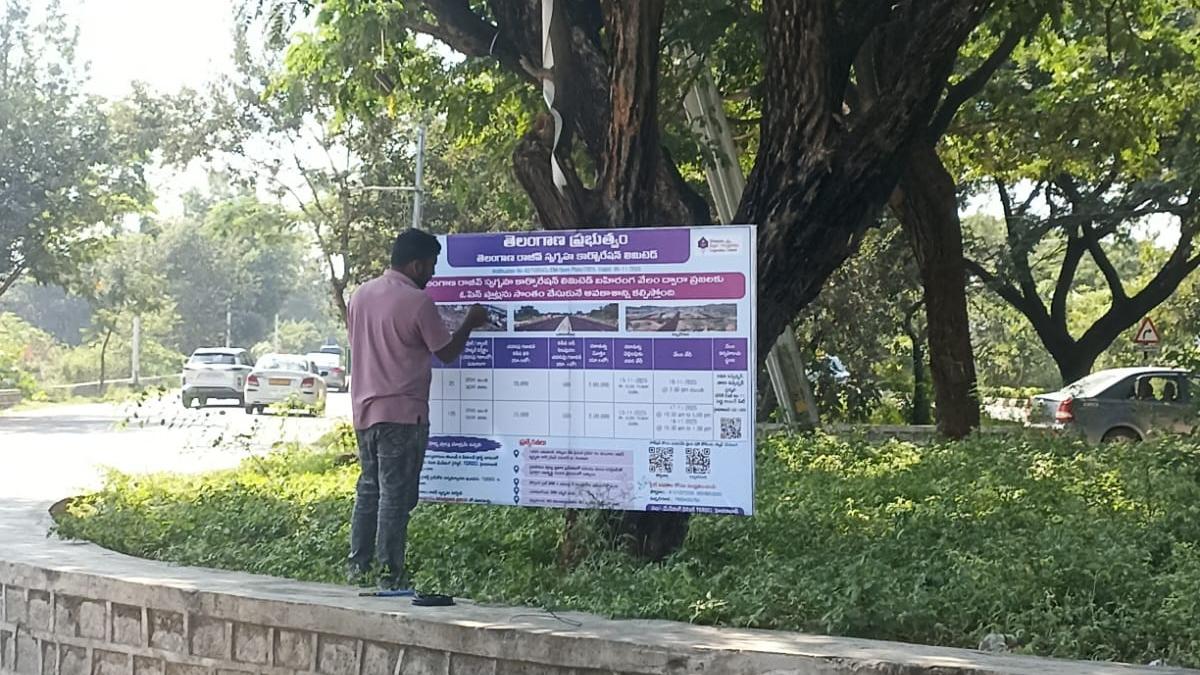 A banner put up advertising the sale of land by the Telangana Rajiv Swagruha Corporation.