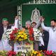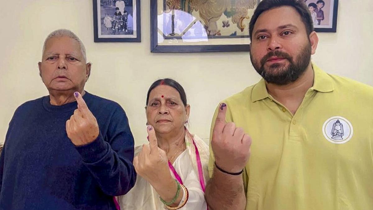 In this image posted on Nov. 6, 2025, RJD chief Lalu Prasad Yadav (left), wife Rabri Devi, and son and party leader Tejashwi Yadav show their ink-marked fingers after casting votes in the first phase of the Bihar Assembly elections, in Patna. Photo: X/@yadavtejashwi via PTI