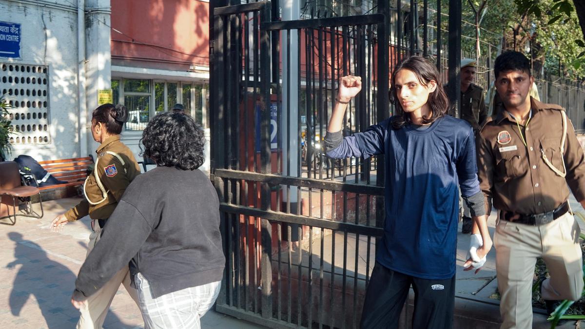 Delhi Police take a protester for producing them at Patiala House Court following their arrest for demonstrating at India Gate with posters of Maoist commander Madvi Hidma, who was recently killed in an encounter, in New Delhi on Saturday.