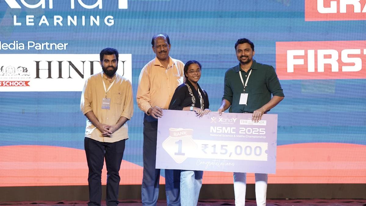 Mohammed Ajmal C., CEO and co-founder of XandY Learning, Sakeer Hussain K.P., Deputy Collector, Palakkad, Shaheer Ambatt, CEO of XandY JEE, handing over the certificate to Liya Fathima, first prize holder in the Class 6 category, at the prize distribution ceremony of National Science and Maths Championship (NSMC) 2025 in Kozhikode on Sunday.