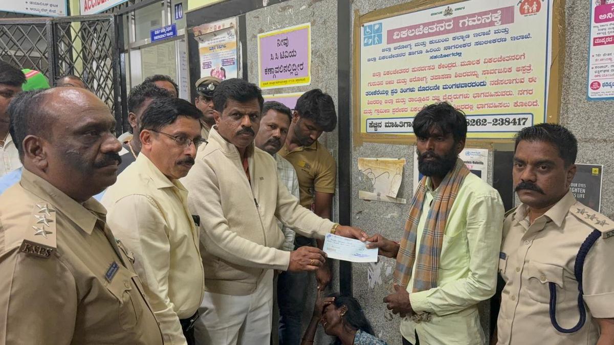 Tarikere MLA G.H. Srinivas hands over a cheque of ₹20 lakh to Basavaraj, who lost his daughter in a leopard attack, on November 20, 2025.