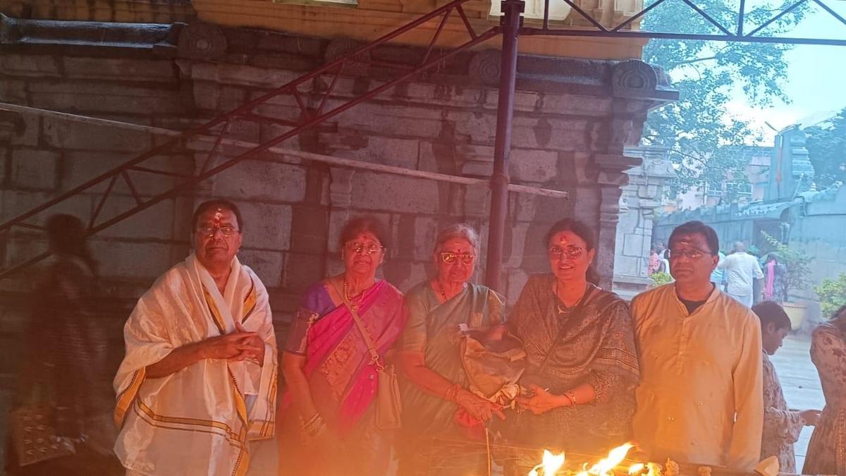 Former undivided A.P. Minister Ponnala Lakshmaiah and his family members lighting lamps on the occasion of ‘Karthika Pournami’ at Srikalahastheeswara Swamy temple in Tirupati district, on Wednesday.