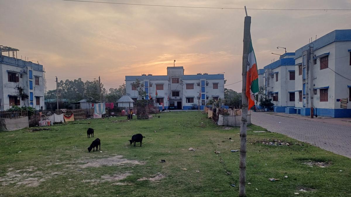 The blue and white paint typically used by the Trinamool Congress government is beginning to peel away at the Dinhata camp that houses 58 families. Several goats and cattle roam in the compound. Some of the apartments are closed as families have migrated for work. Pumpkin vines grow on a trellis and other vegetables are being cultivated between the two-storey buildings.