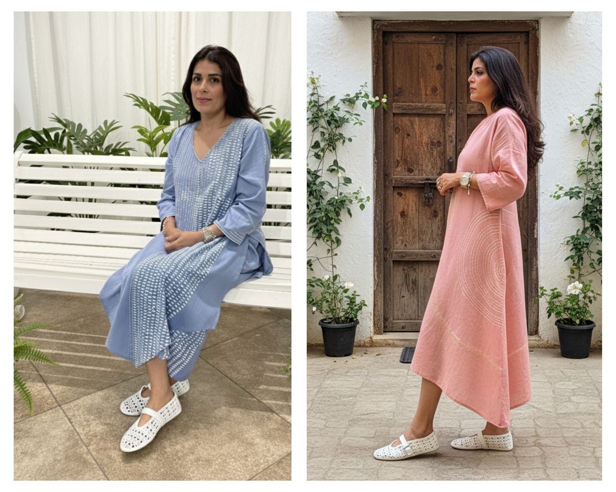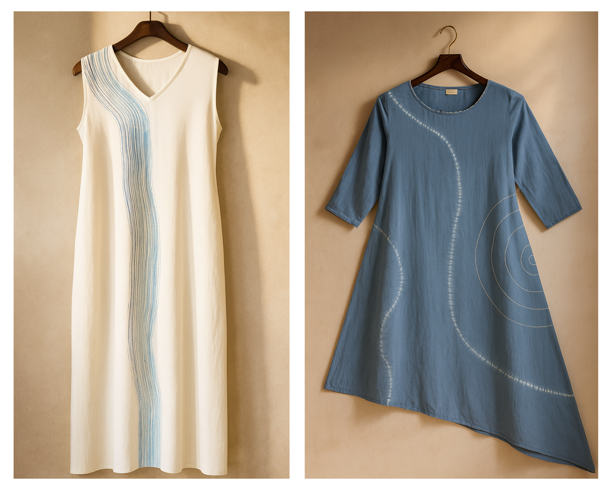 “We see this as a way to showcase the versatility of khadi by allowing different creative voices to interpret it. Each collaboration will explore a different design language, audience, and approach,” he says. The new collection, Songs of the Spindle (₹5,000-₹8,000), features co-ord sets, dresses, kurtas, and jackets — with hand-printing, embroidery, dip dyes and shibori, and Kaveri’s signature prints and gold foiling techniques.
