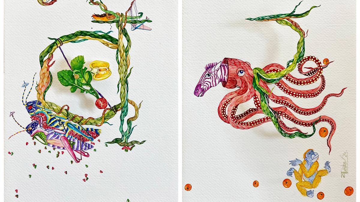 “I think I live in my own wonderland,” Yashika Sugandh says. Or, as she sometimes calls it, her “la la land”. It’s not a metaphor. When the contemporary artist looks at ordinary things, they refuse to stay still. Chairs sprout parrots and monkeys through horn-shaped funnels; a snail drifts away in a makeshift hot-air balloon as a hippo gazes upwards; tree branches knot and twist, crawling with leopards, chameleons, blue elephants, and rubber ducks. Her world is one where the rules of reality are forever bent towards play.