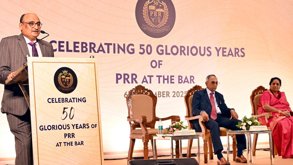 Justice Sunder Mohan of the Madras High Court speaking at the felicitation of Advocate P. R. Ramakrishnan in Coimbatore city on Saturday.