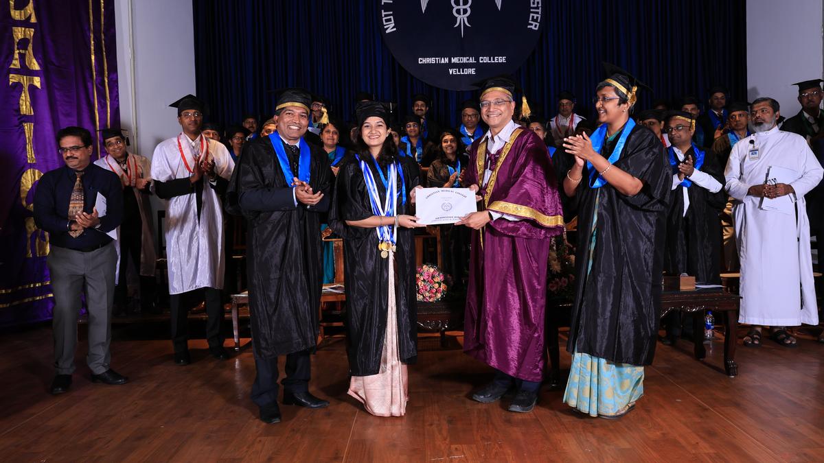 Professor Govindan Rangarajan, Director, IISc, Bangalore, gave away the best outgoing student award to Esha Joe at the graduation day ceremony at the CMC campus in Vellore. CMC College principal Solaman Satish Kumar is also seen.