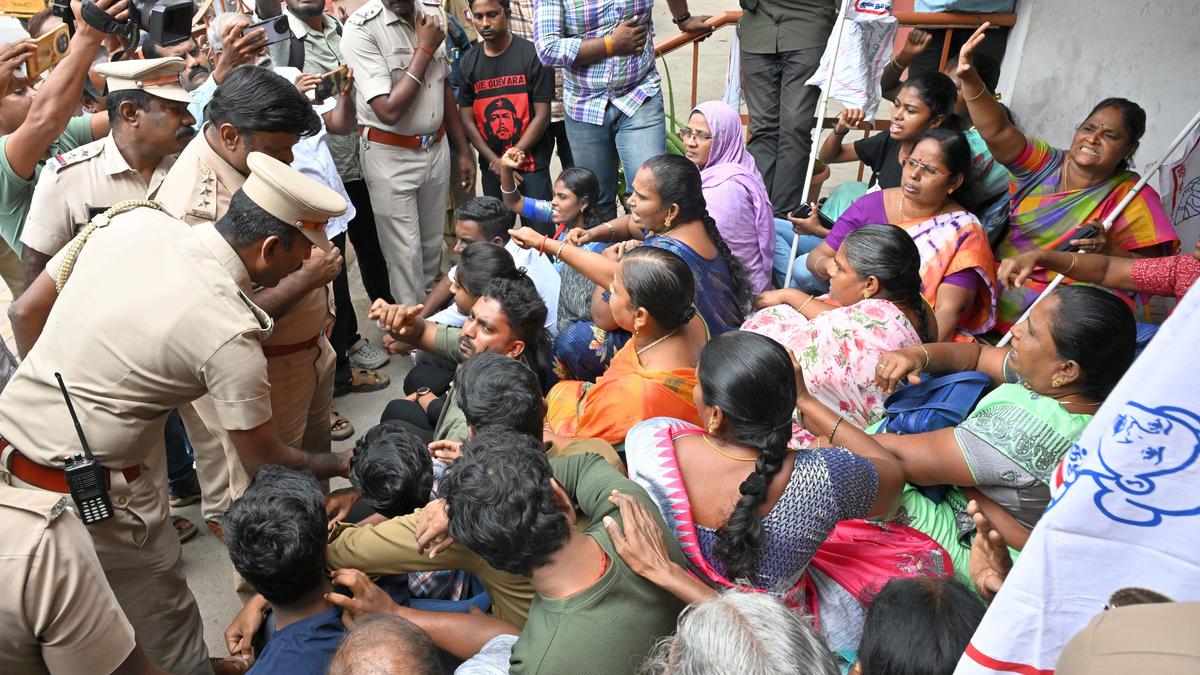 AIDWA and DYFI members staging a protest at the All Women Police Station at Crime Branch in Madurai on Monday.