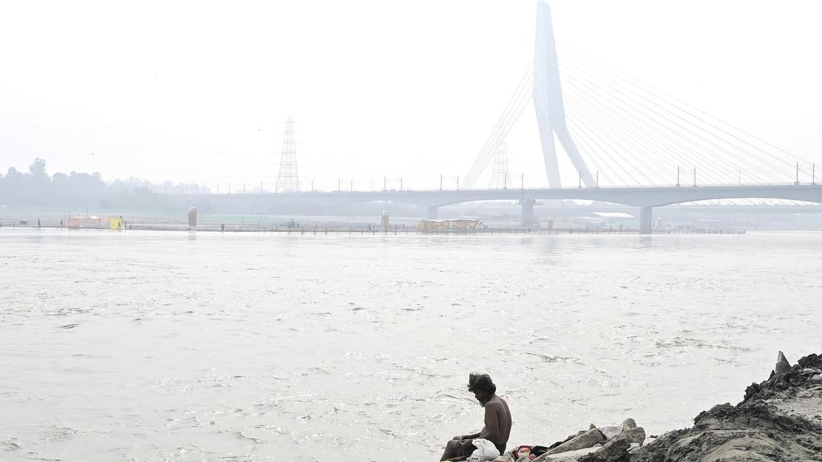 A layer of smog engulfs Signature Bridge Wazirabad as the Air Quality Index remains in the “Very Poor” category, in New Delhi on October 27, 2025.