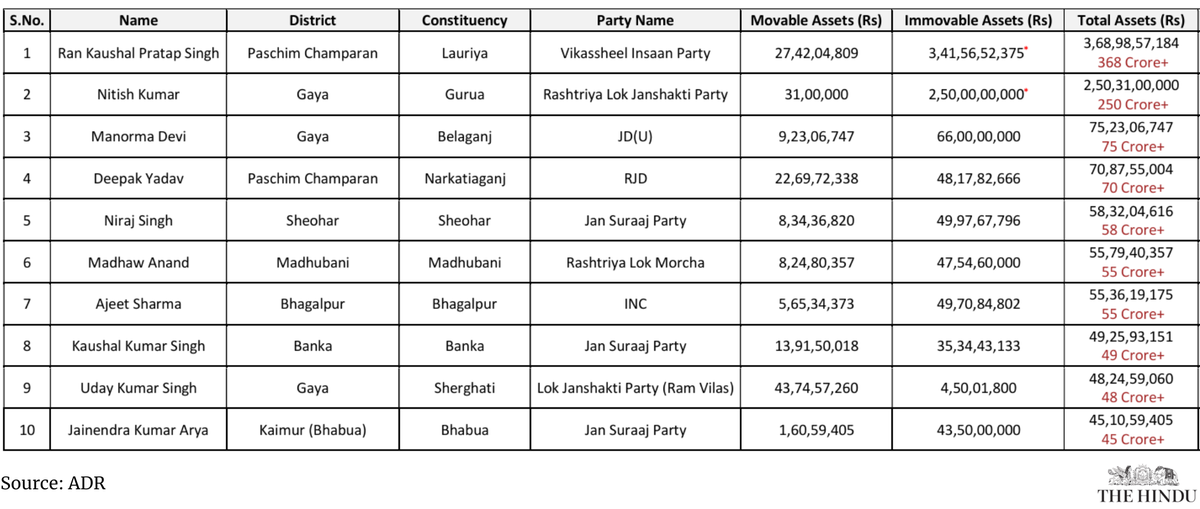 Party-wise analysis of assets shows that Jan Suraaj Partyāās candidates have average assets of over ā¹5 crores, where as those of BJP and RJD have average assets of around ā¹6.4 crore. Average assets of Congress and JD(U) candidates amounted to ā¹7.4 crore and ā¹9.1 crore, respectively, as shown in the table below.