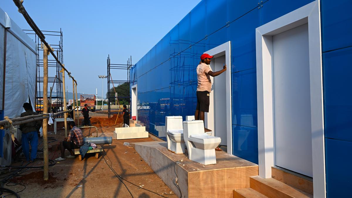 Workers setting up the main venue of the CII Partnership Summit, scheduled for November 14 and 15, on AU Engineering College Grounds in Visakhapatnam on Sunday.