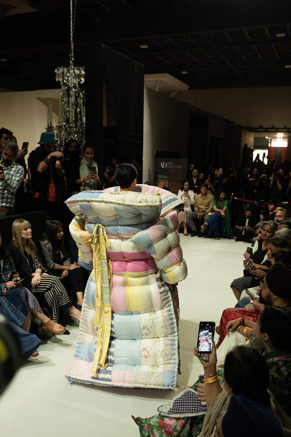 Aneeth Arora, the elusive creative force behind the brand, staged a presentation that turned bedding into theatre. Models glided out wrapped in mattresses and quilts, their silhouettes pitched between surreal tableaux and DIY architecture.