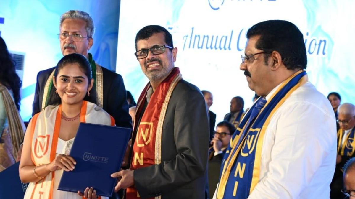 A student receives her degree at the 15th convocation of Nitte (Deemed-to-be-University) in Mangaluru on November 7, 2025.