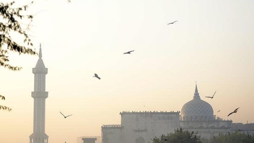 Birds fly around a mosque as smog blankets the city amid deteriorating air quality, in…