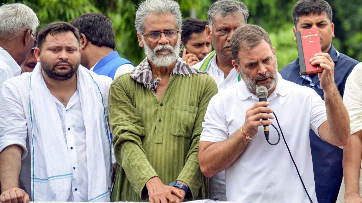 Left to right, leaders of the INDIA alliance, RJD leader Tejashwi Yadav, Opposition in the Lok Sabha and Congress MP Rahul Gandhi, CPI (ML) Liberation General Secretary Dipankar Bhattacharya. File
