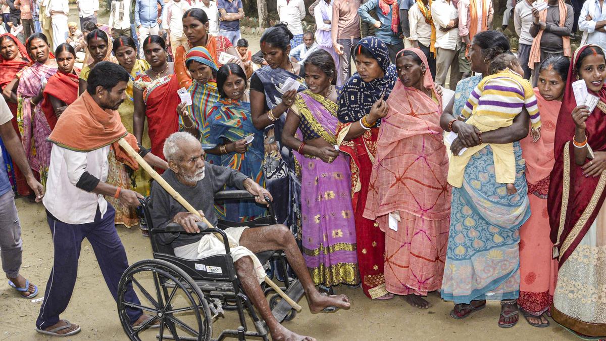 An elderly man arrives at a polling station to cast a vote during the second and final phase of the Bihar Assembly elections, in Jehanabad on November 11, 2025