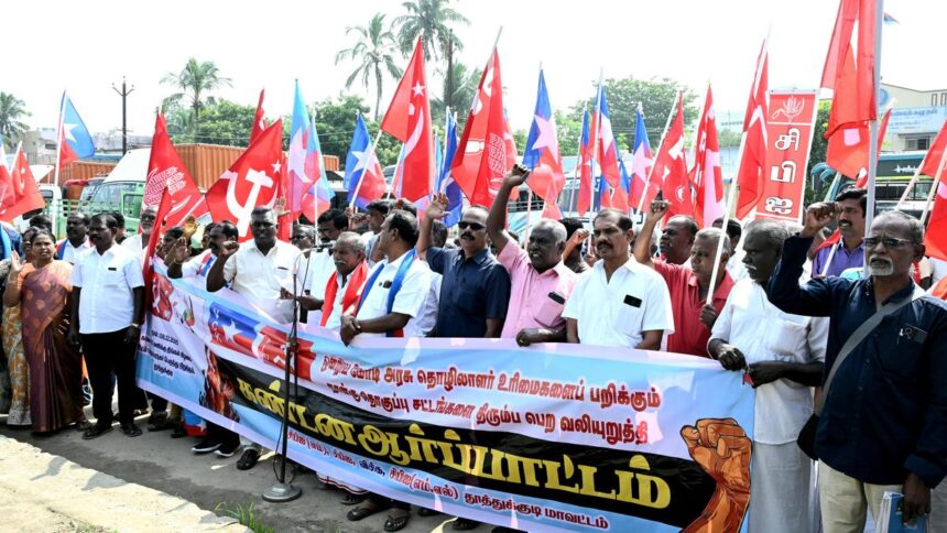 Cadre of Left parties and VCK staging a demonstration in Thoothukudi on Monday. | Photo…