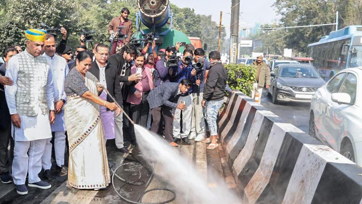 Delhi Chief Minister Rekha Gupta cleaning a road with a water sprinkler in New Delhi on Saturday