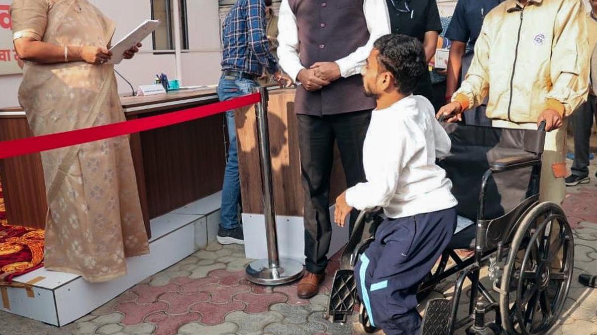 Delhi Chief Minister Rekha Gupta Minister listens to the concerns of a specially abled person during the grievance redressal program on Wednesday.