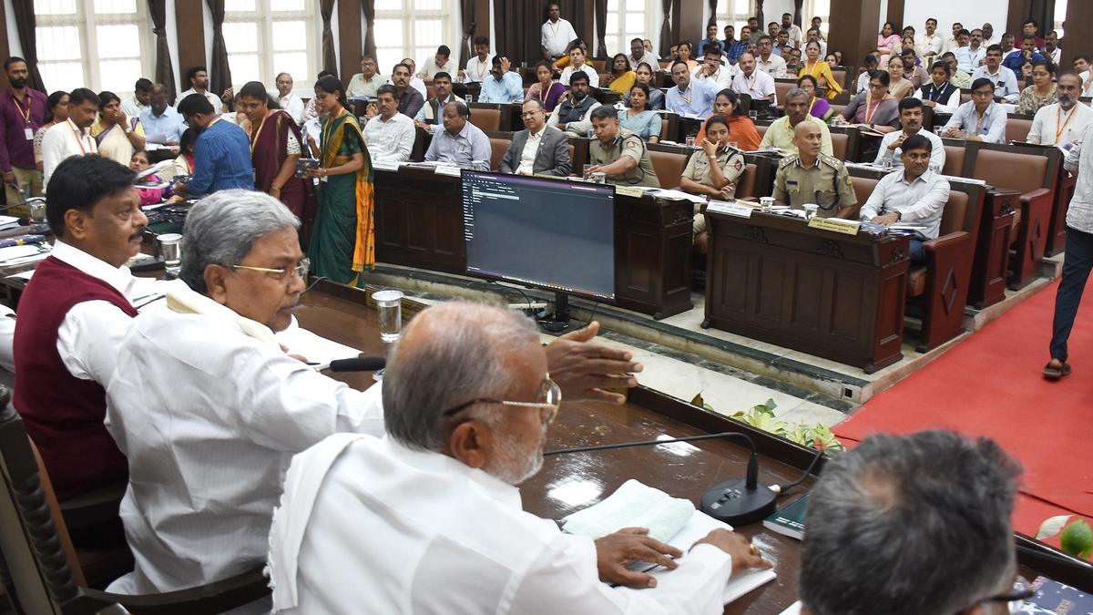 Chief Minister Siddaramaiah participating in a Karnataka Development Programme (KDP) meeting in Mysuru on Monday.