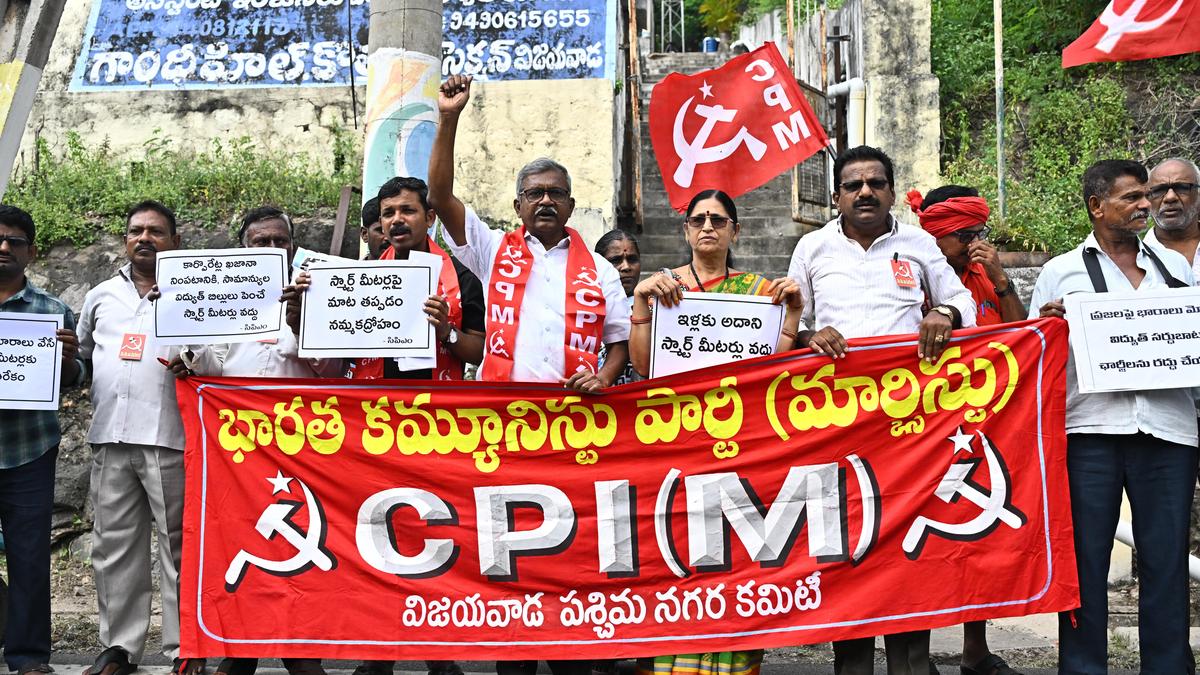 CPI(M) leaders led by State secretariat member Ch. Babu Rao staging a protest against smart meters in Vijayawada on Tuesday.