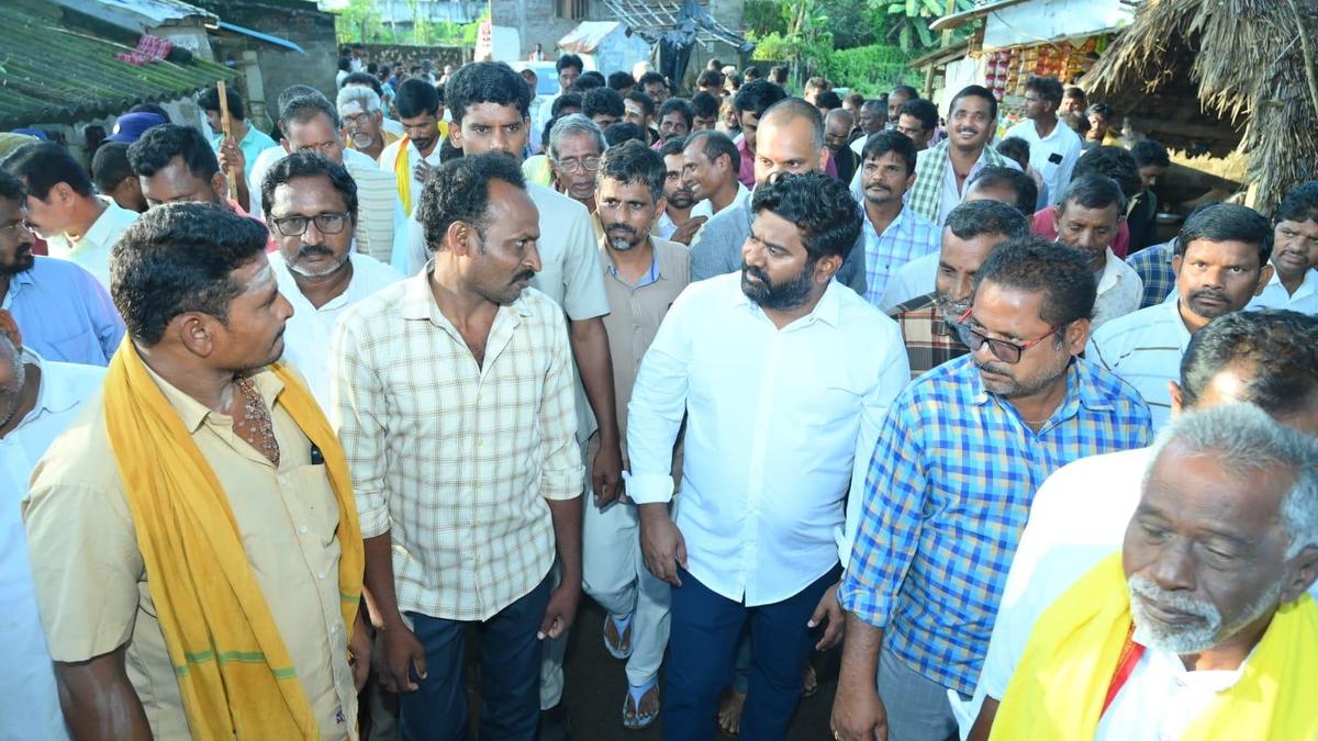 MLA Bonela Vijaya Chandra interacting with locals after distributing essential goods in Vantaram village, Balijipeta mandal, om Parvatipuram -Manyam district on Thursday.