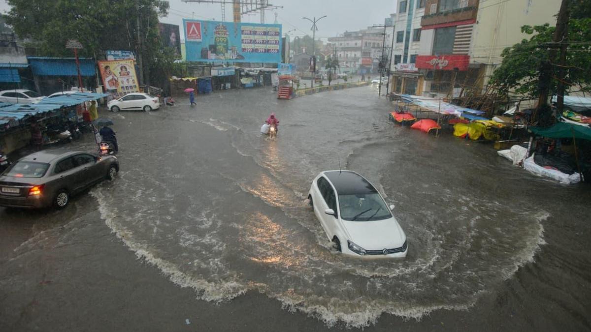 Vehicles wading through the heavy rainwater caused by the impact of Cyclone Montha, in Ongole on Tuesday.