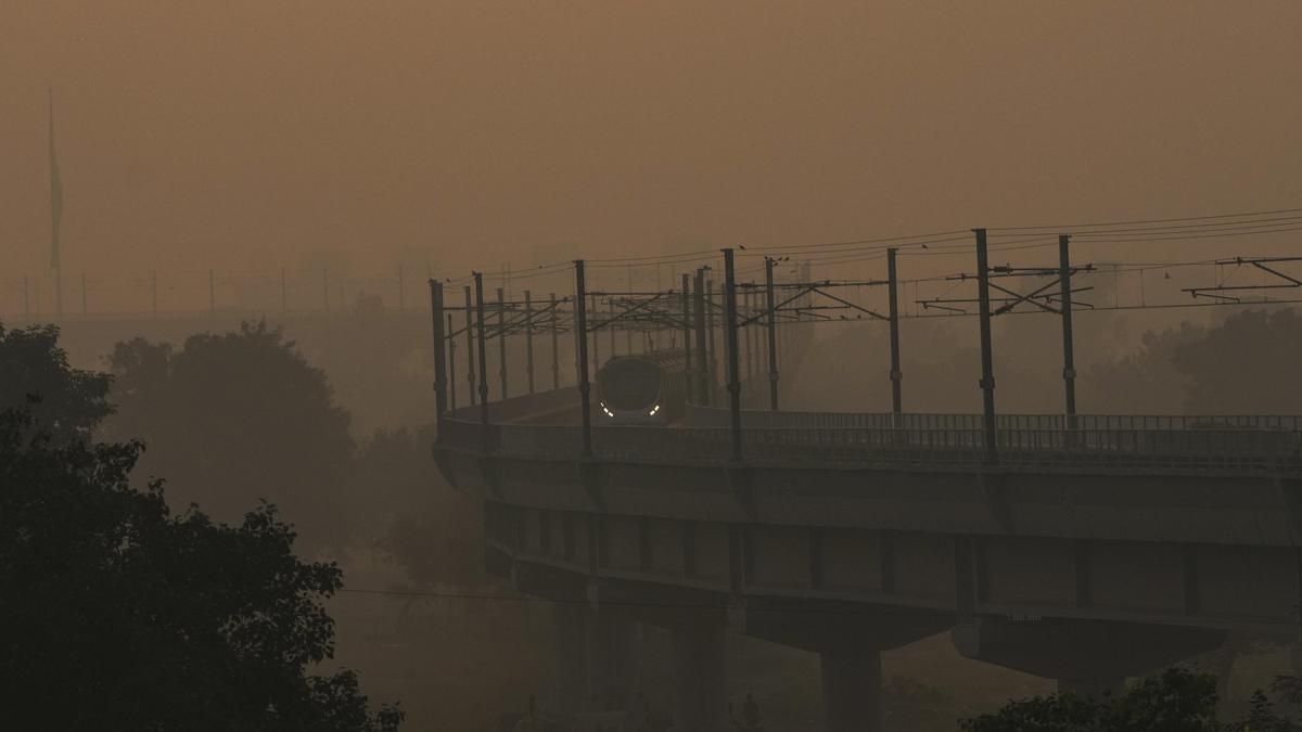 A metro train makes its way on a hazy morning amid low visibility in New Delhi.