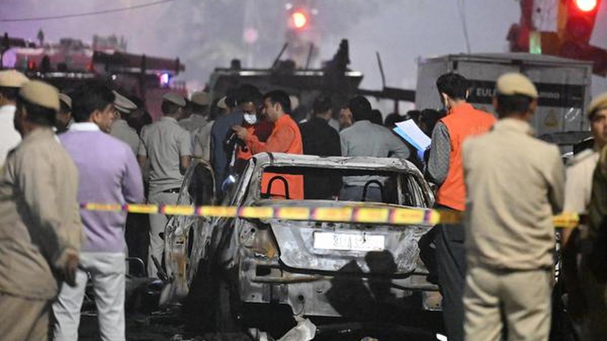 Security personnel at the blast site near the Red Fort in Delhi on November 10, 2025.
