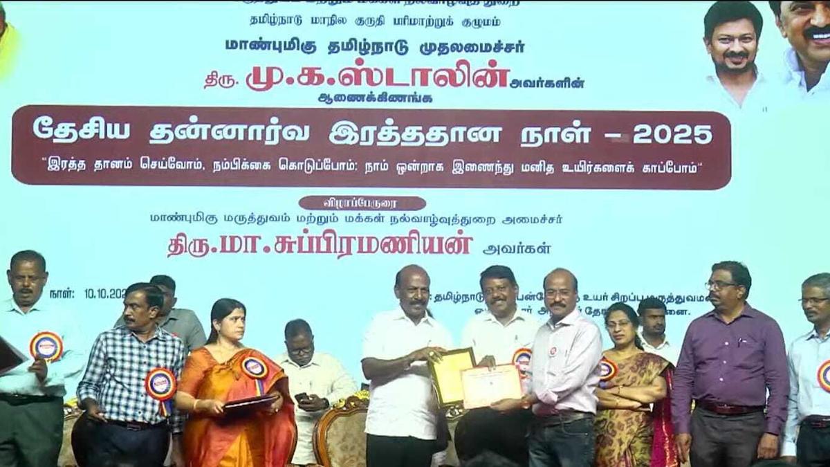 On the occasion of former Chief Minister of Tamil Nadu Kamarajarâs birthday, Theni Melapettai Hindu Nadargal Uravinmurai (TMHNU), Theni, organised a special blood donation camp. People of Theni District, teachers, and students from all schools and colleges donated their blood. It was conducted on National Voluntary Blood Donation Day at Tamil Nadu Multi-Speciality Hospital. Minister for Health and Family Welfare Ma. Subramanian presented the award for the service. TMHNU General Secretary M. M. Anandavel received the award.