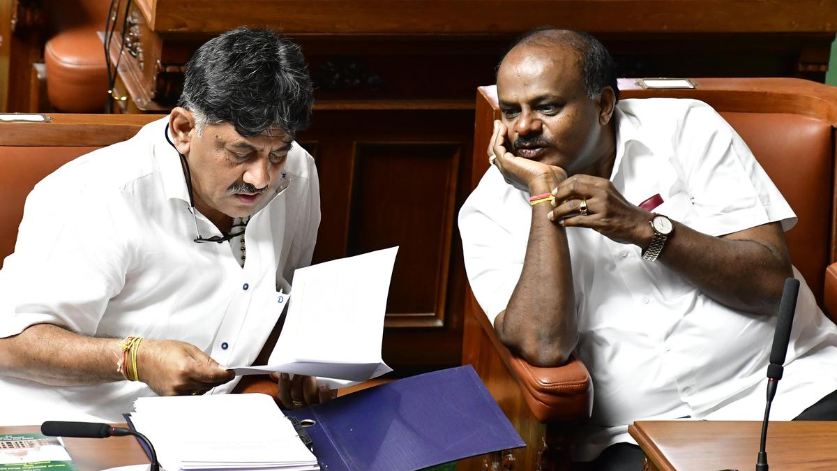 A file photo of D.K. Shivakumar and H.D. Kumaraswamy in the Karnataka Legislative Assembly.