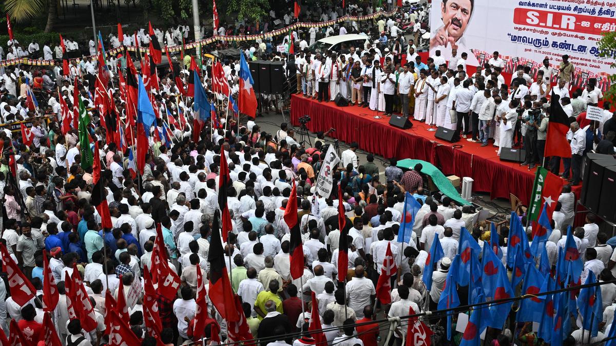 At the protest, Salem MP T.M. Selvaganapathi said that the SIR is a danger for Indian democracy. Voting rights are the base for Indian democracy. Allegedly unable to confront the DMK directly, the BJP introduced the SIR. After the SIR was announced, 6.36 crore voters lost their voting rights, and only after registration, the voter will get voting rights again. The forms of SIR are not understandable for a common man. How it could be completed in one month. The anganwadi centre workers and VAO assistants are involved in the SIR works and how they could complete the works in one month, he questioned.