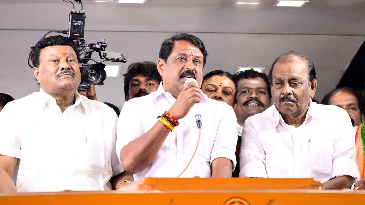 BJP state president Nainar Nagendran addressing in ‘Tamailagam Thalai Nimira Tamilanim Payanam’ campaign meeting held at Batlagundu in Dindigul district on Tuesday.