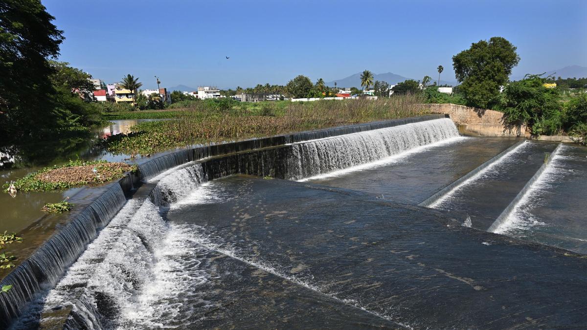 Water flows through a check dam on the Noyyal near Sunnambu Kaalvai in Coimbatore city.