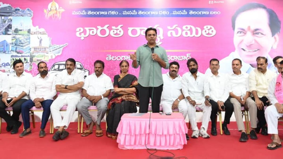 BRS working president K.T. Rama Rao speaking at a party meeting in Hyderabad on Saturday.