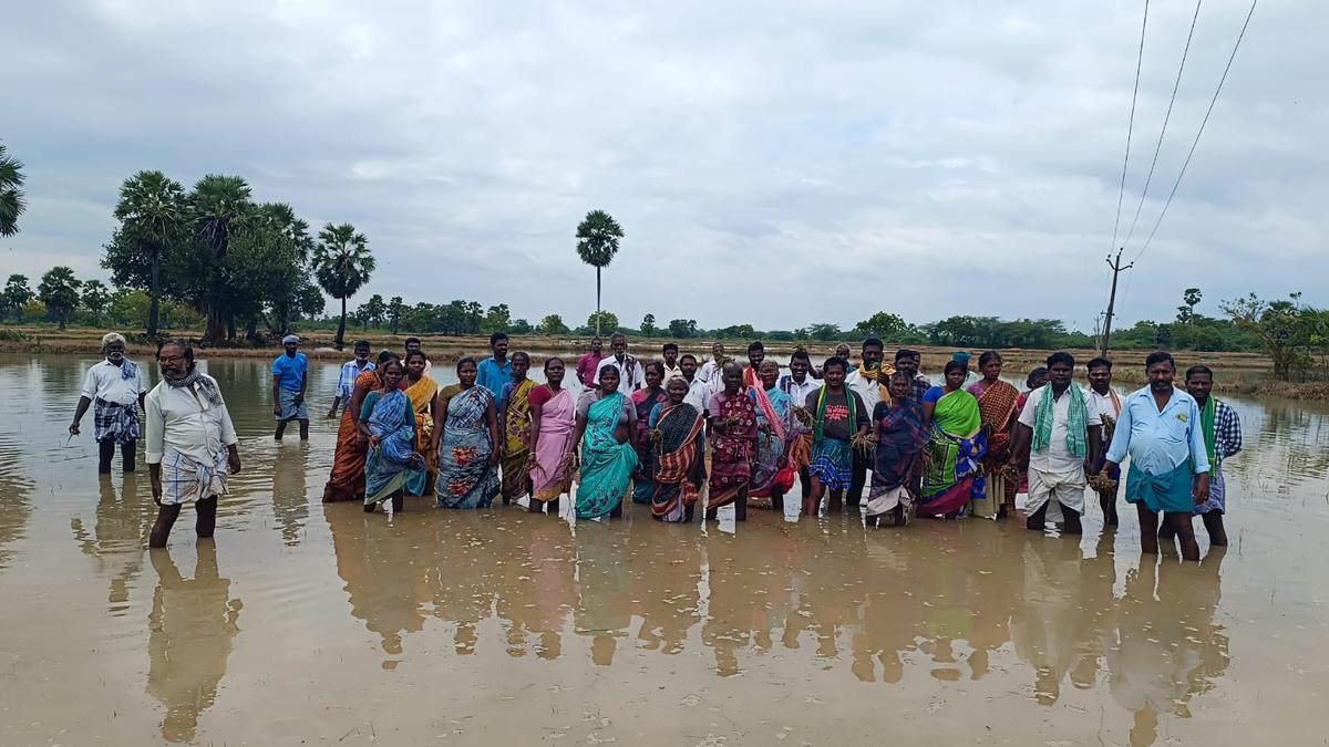 The agitation, led by S.R. Tamil Selvan, a farmer leader from the Tamil Nadu Farmers’ Protection Association, highlighted large-scale inundation in the region. “Nearly 15,000 acres in Kilvelur taluk have been affected,” Mr. Tamil Selvan said, standing alongside farmers ankle- to knee-deep in water.