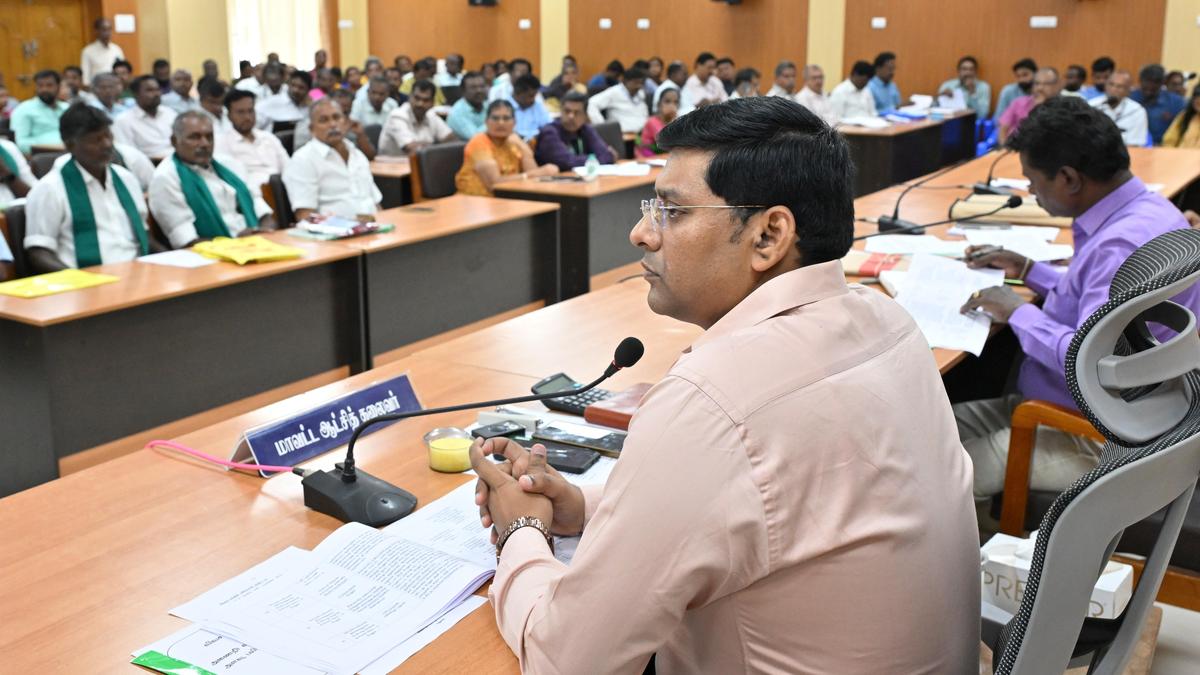 Collector K.J. Praveen Kumar presiding over the farmers’ grievance meet in Madurai on Thursday.