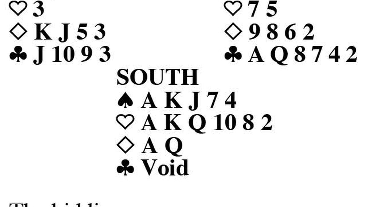 South made several efforts to gain the information that would enable him to bid a grand slam before settling for six hearts. Partner had four-card heart support, but the rest of the dummy was a disappointment