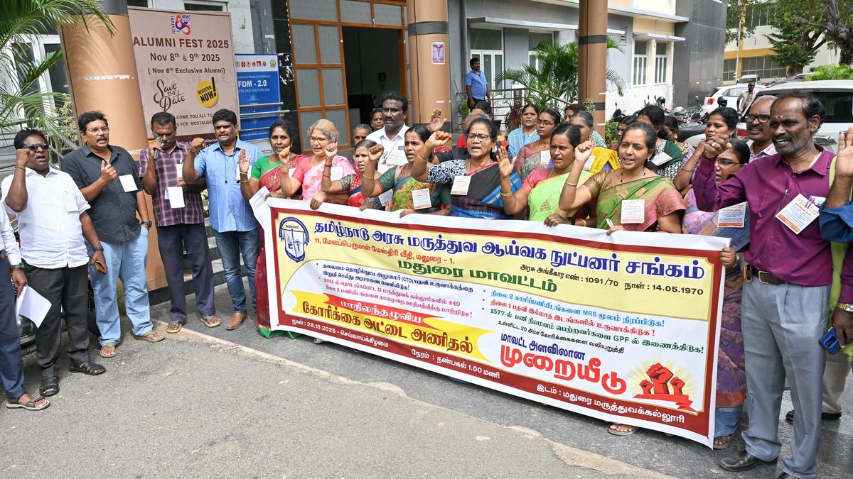 Members of Tamil Nadu Government Medical Laboratory Technicians’ Association staged a demonstration on Madurai Medical College premises on Tuesday, urging the State government to fulfil their 20 pending demands.