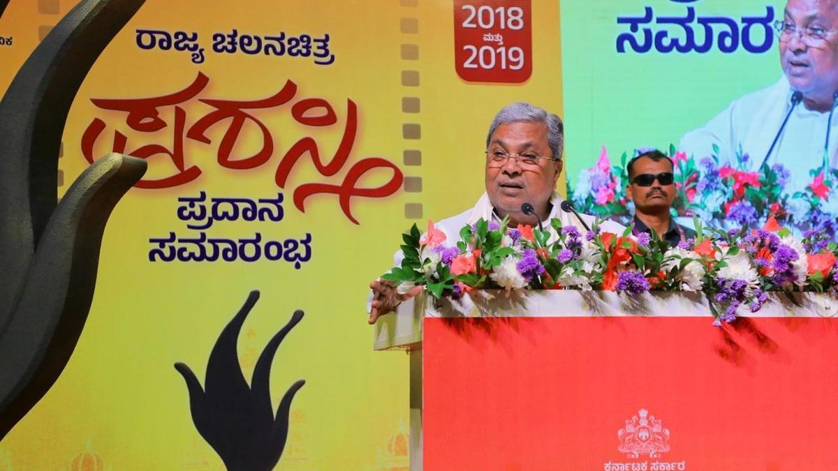 Chief Minister Siddaramaiah addressing the gathering of film personalities after inaugurating the State film awards presentation ceremony in Mysuru on Monday.