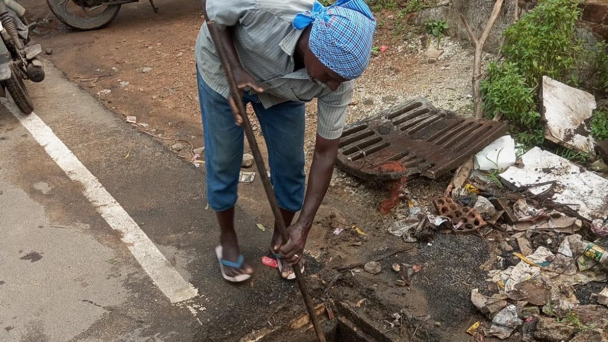 A worker seen cleaning a silt catch pit on Korattur Railway Station Road.
