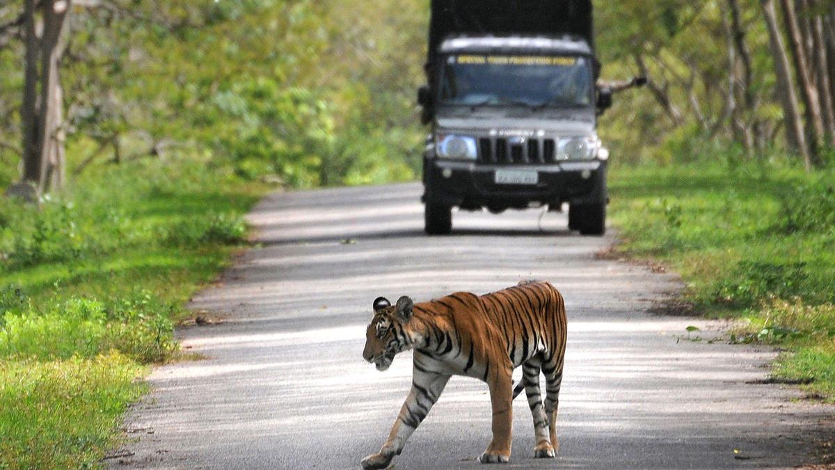 A tiger ambles past a safari vehicle at Antharsanthe range of Nagarahole National Park in Mysuru.