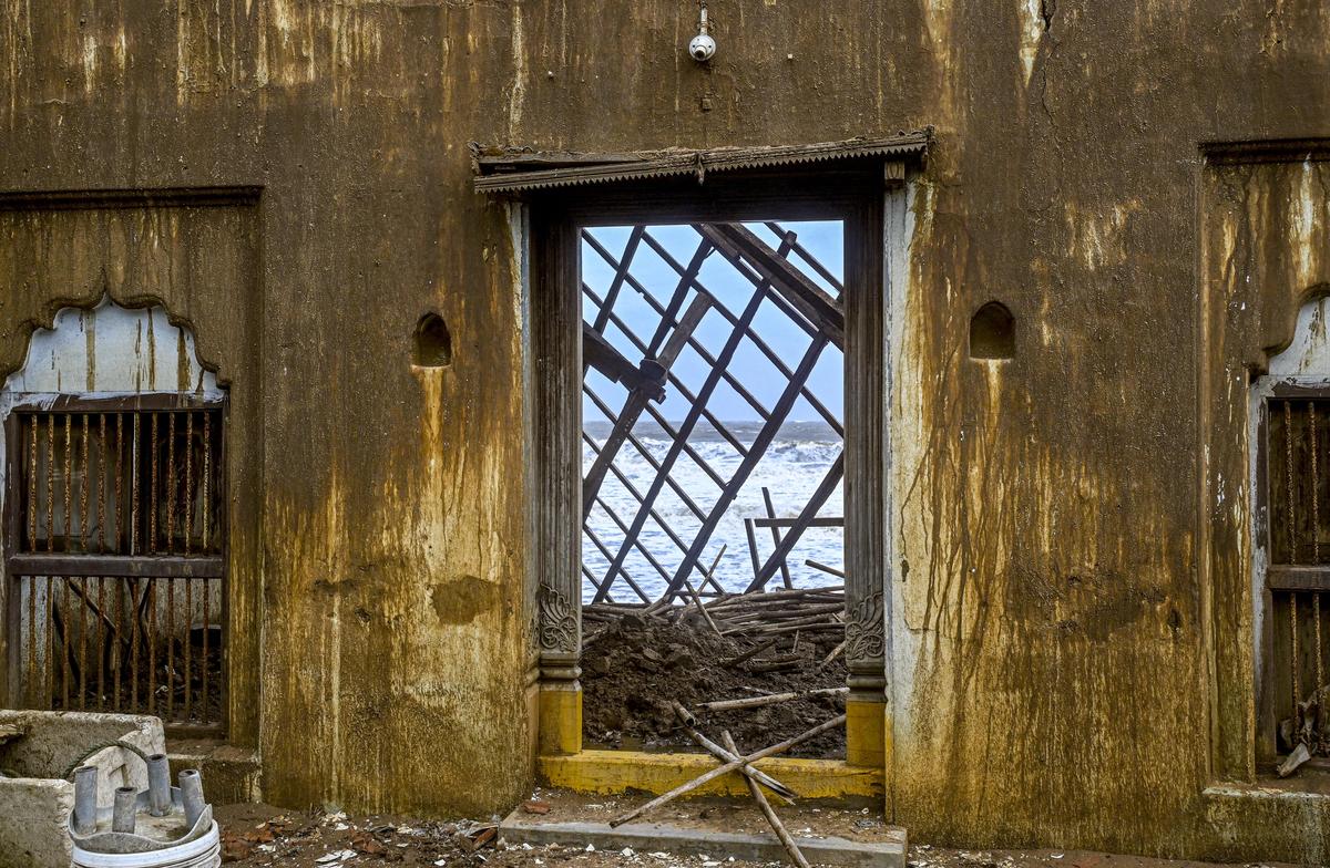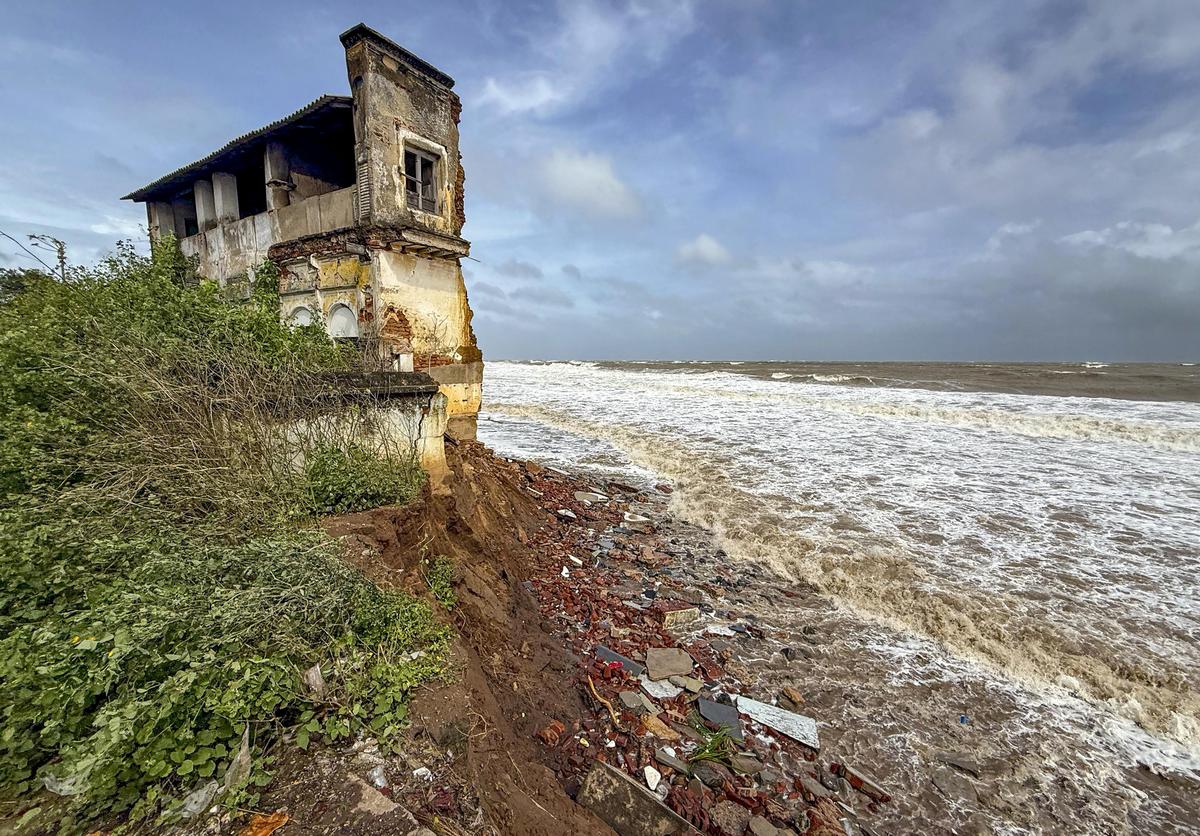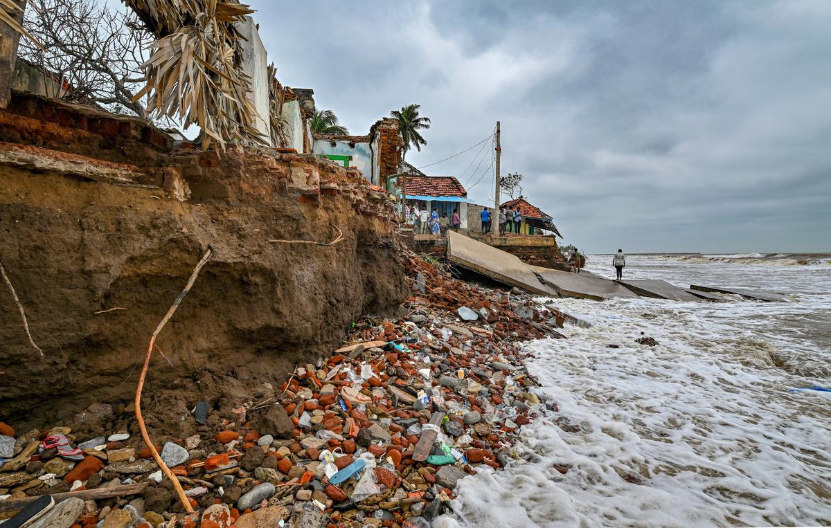 Unsteady perch: In Uppada, a dilapidated house — half of it washed away by the waves — struggles to stay upright in the strong winds.