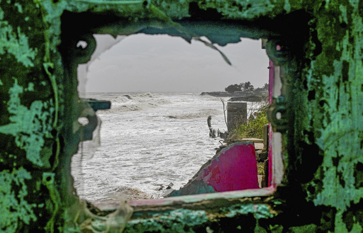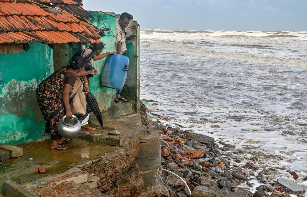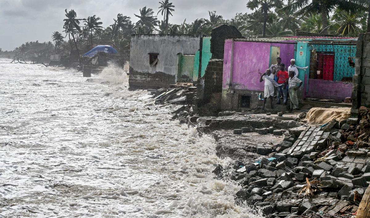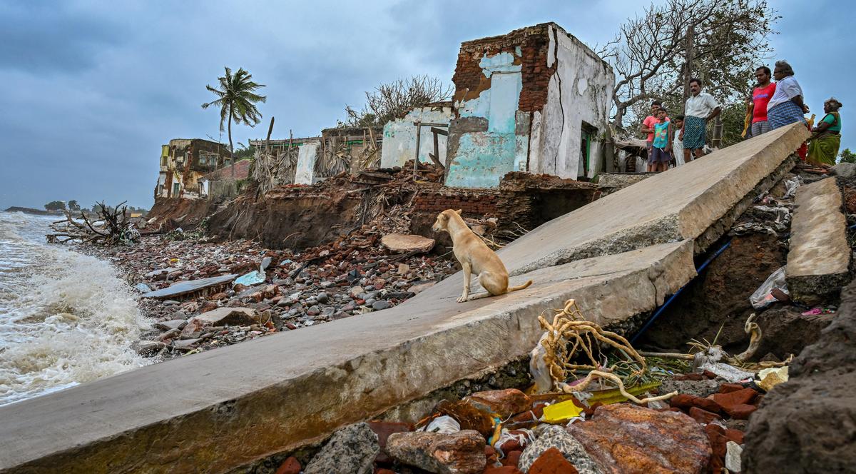 Unsteady perch: In Uppada, a dilapidated house — half of it washed away by the waves — struggles to stay upright in the strong winds.
