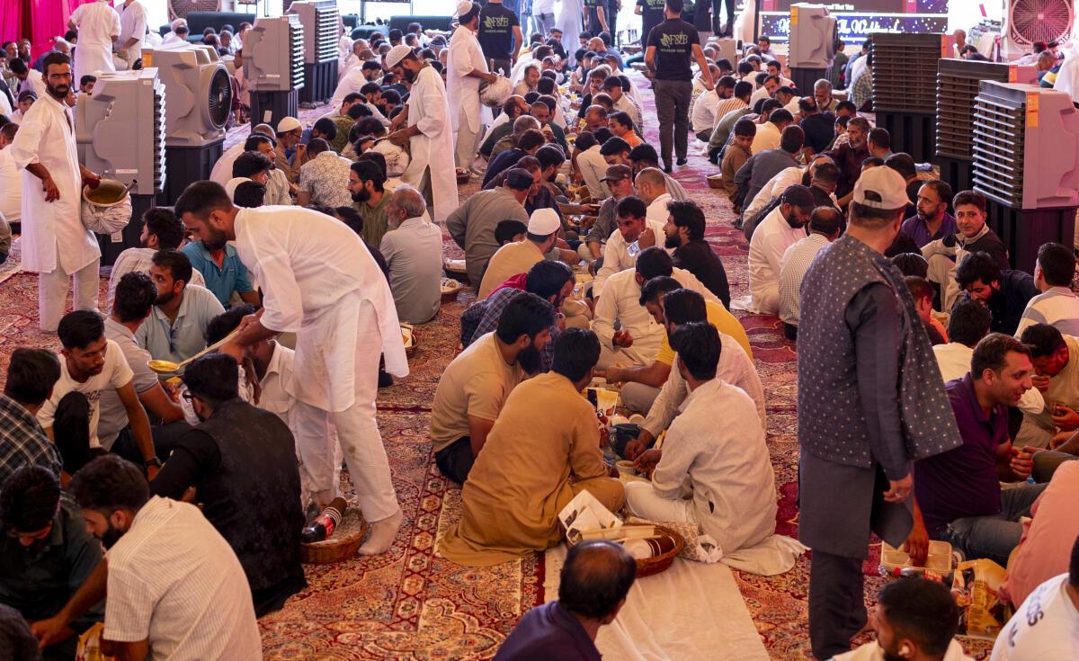 Guests are seated in groups of four around large copper plates called tramis, heaped with fragrant rice and topped with the array of delicacies.