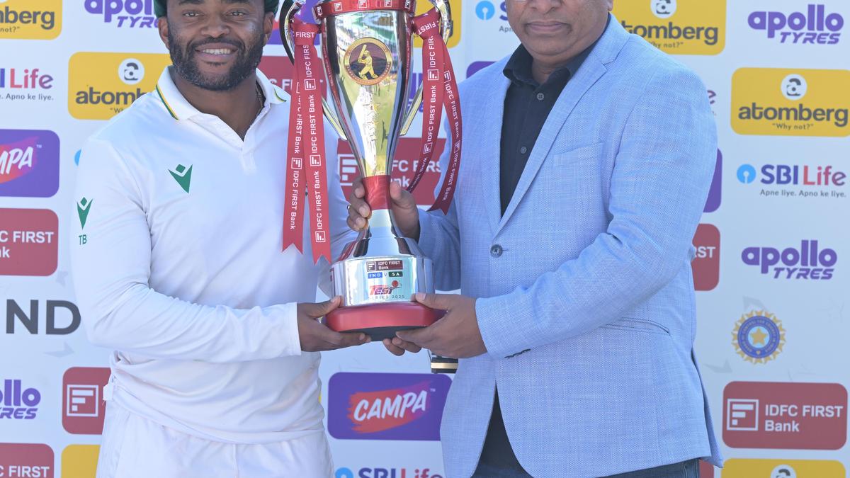 South Africa’s captain Temba Bavuma receives winning trophy from BCCI secretary Debojit Saikia during the second test match at Barsapara Stadium in Guwahati on November 26, 2025.